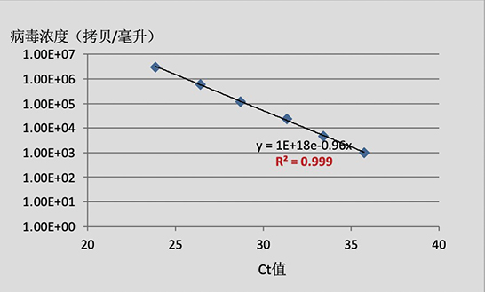 2、不同浓度的病毒液利用该设备提取得到的核酸进行PCR检测,得到的Ct值与病毒浓度对数之间呈现较好的线性关系,R2=0.999,说明该设备对于不同浓度病毒核酸的提取表现稳定。