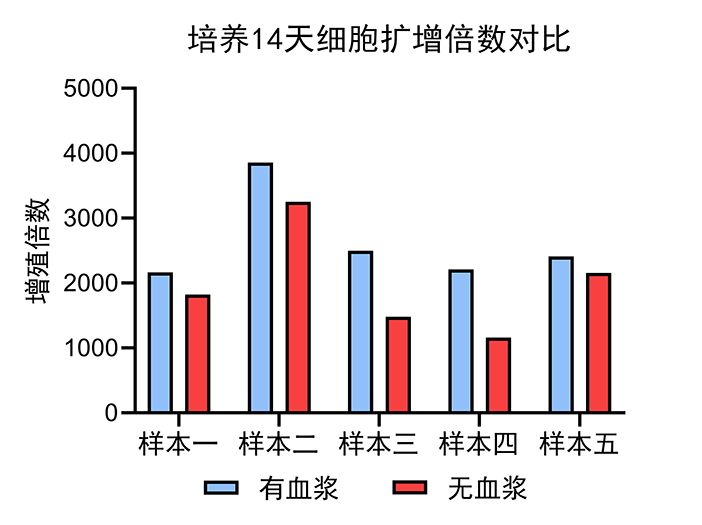 通过连续培养五个样本,在不添加自体血浆情况下,总细胞扩增倍数高于1000倍。
